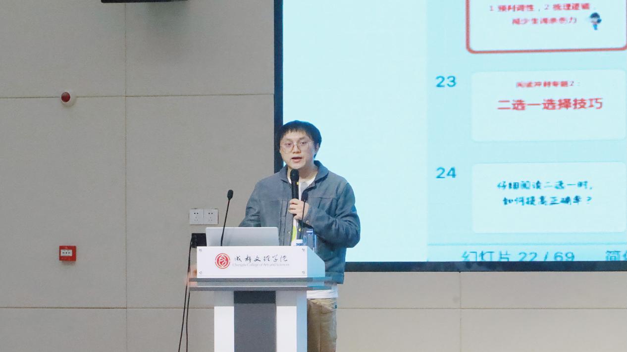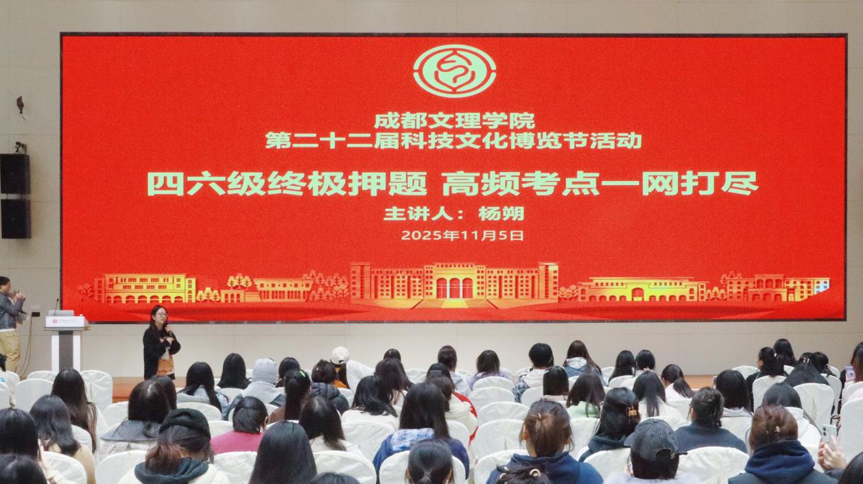 2025年11月5日下午,学校科博节缤纷校园系列活动之《四六级考前冲刺:高频考点一网打尽》专题讲座在国际交流中心报告厅成功举行。本次活动特邀杨朔老师担任主讲,围绕四六级考试的核心考点与冲刺阶段的复习策略,为即将参加2025年下半年考试的同学们带来系统而实用的备考指导。