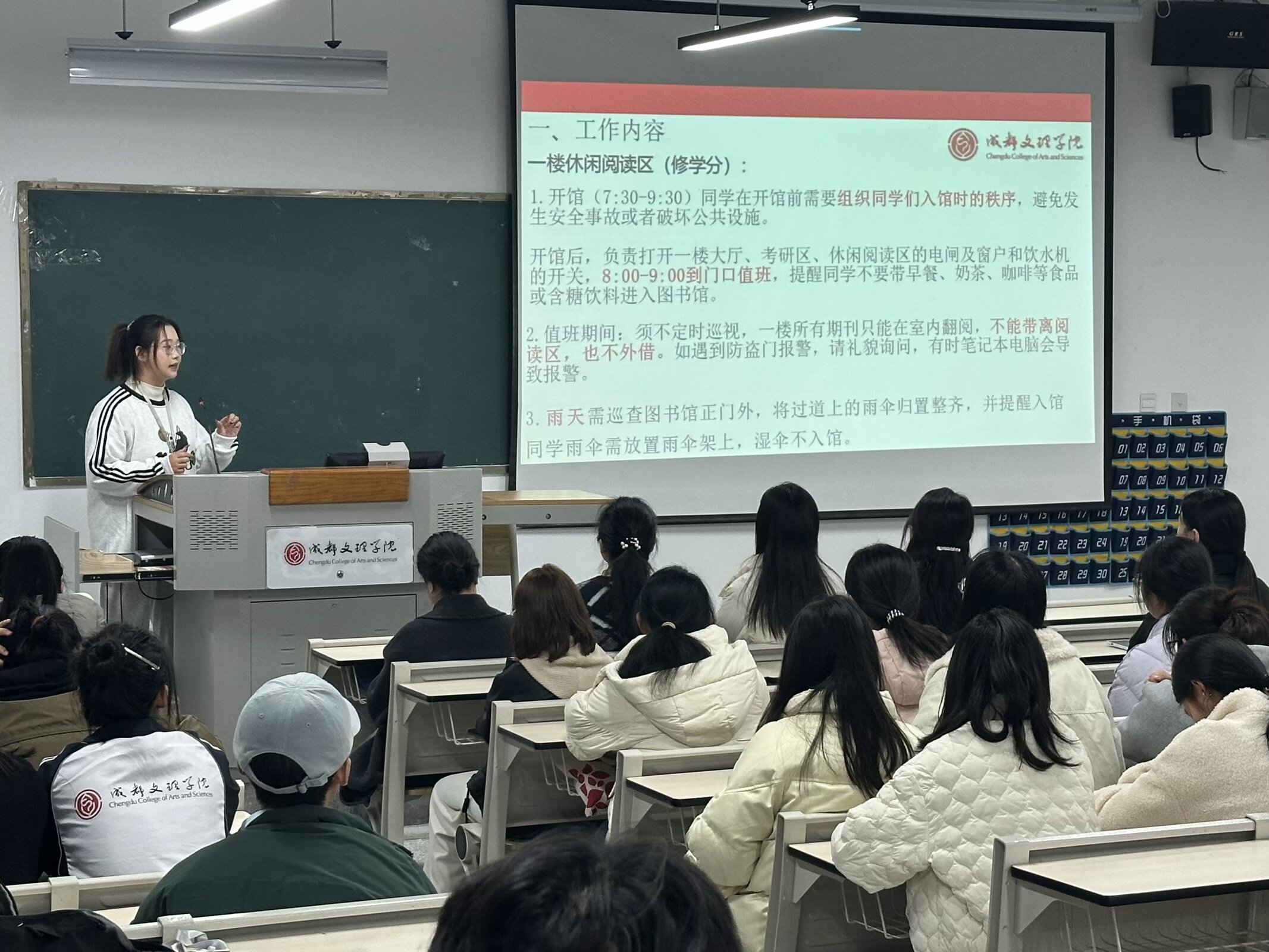 为进一步夯实图书馆学生服务根基,提升服务效能,明确下一阶段工作方向与核心任务,11月26日下午,图文信息中心在行政楼B101教室顺利召开2025-2026学年第一学期图书馆学生工作第二次会议。图书馆学生管理委员会副主席贺自菲主持会议,指导老师蒲小英、杨波、刘腾忆等出席,全体学生助理参会。