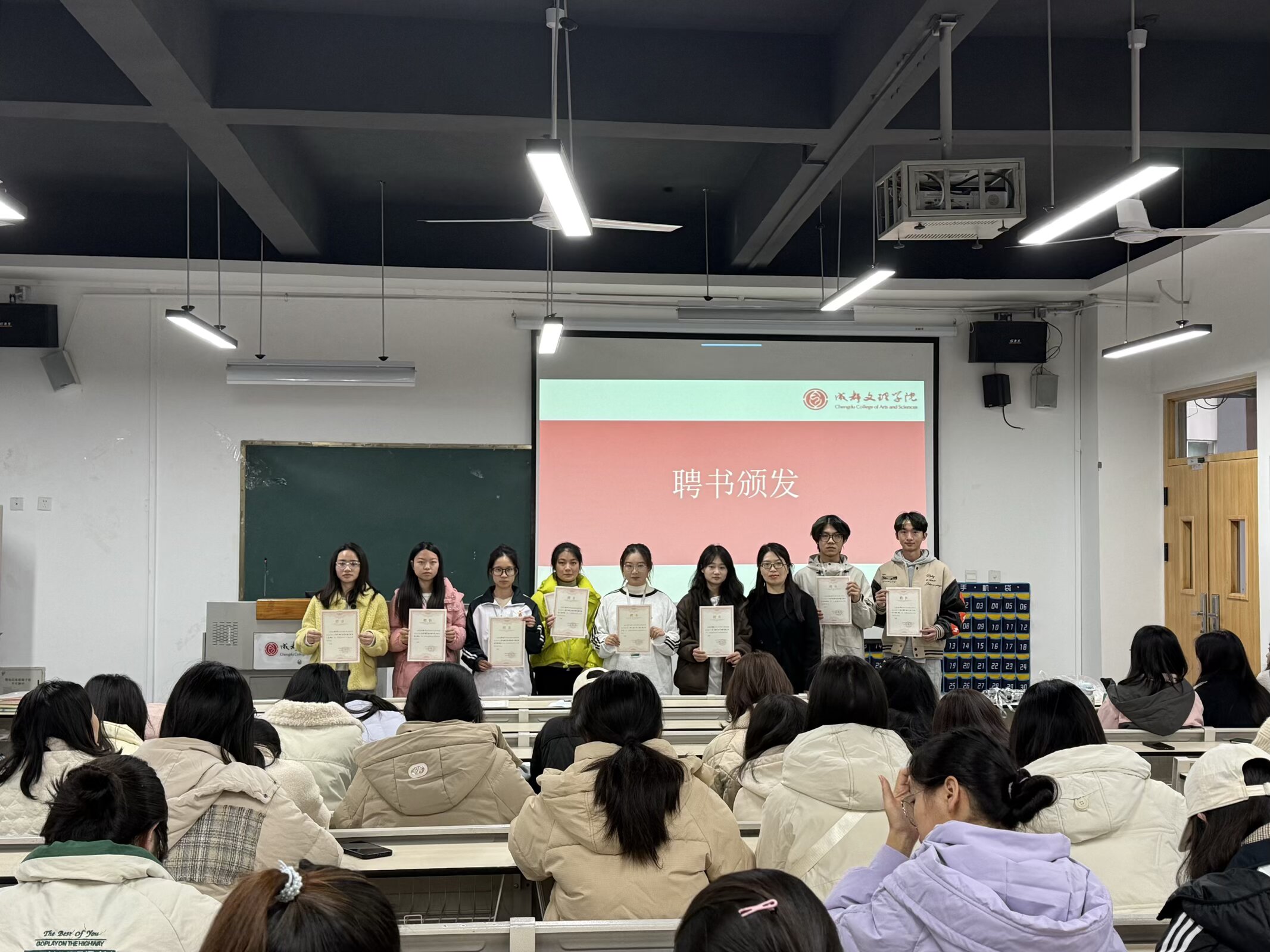 在聘书颁发环节,图书馆指导老师蒲小英为周锐、贺自菲等10名图书馆学生管理委员会干部正式颁发聘书。她在致辞中勉励各位学生干部牢记“服务读者”的初心使命,主动担当作为,以高度的责任感和执行力推动图书馆学生工作再上新台阶,充分发挥学生骨干的桥梁纽带作用。