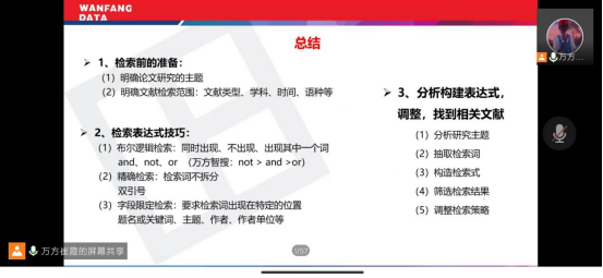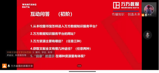 讲座尾声时,崔霞老师再次带领同学们总结讲座内容,回答同学们提出的问题,提高了同学们对万方数据知识服务平台的应用能力。