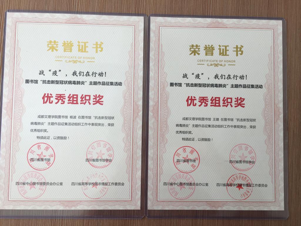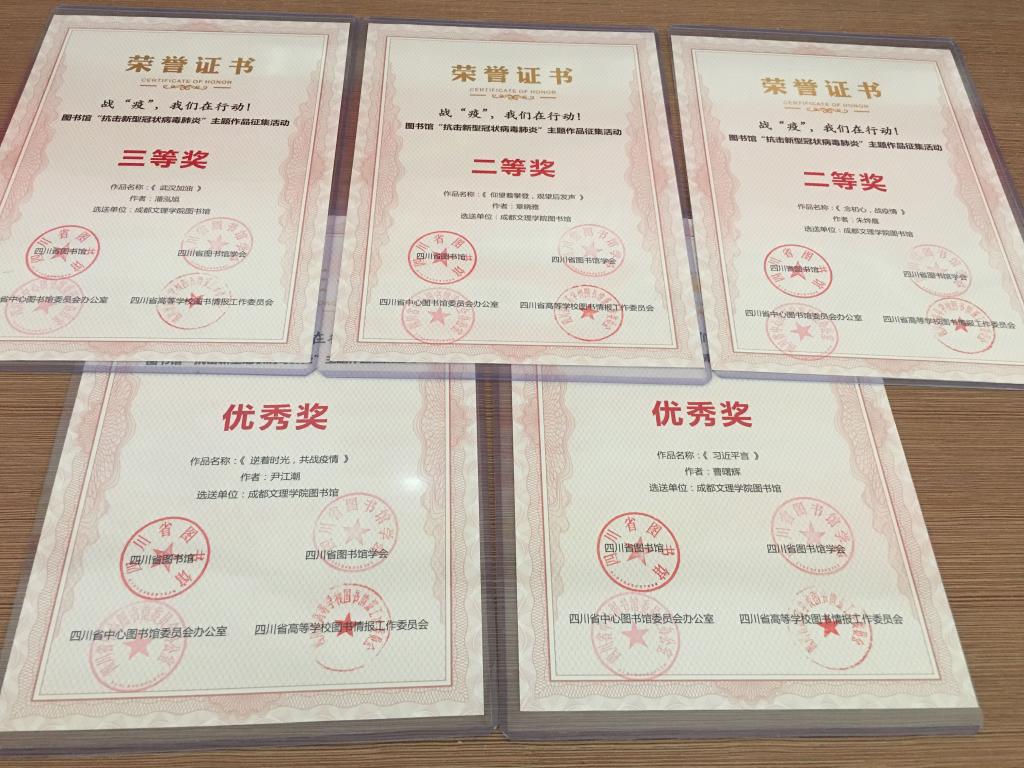 近日,我校图文信息中心参加了由四川省高等学校图书情报工作委员会主办的,主题为“书香助力战‘疫’,阅读通达未来”第三届“悦读新时代:四川高校阅读文化节”系列丰富多彩的阅读推广活动,其中,在图书馆“抗击新型冠状病毒肺炎”主题作品征集活动和第三届“图书馆杯”四川全民英语口语大赛中分获佳绩。