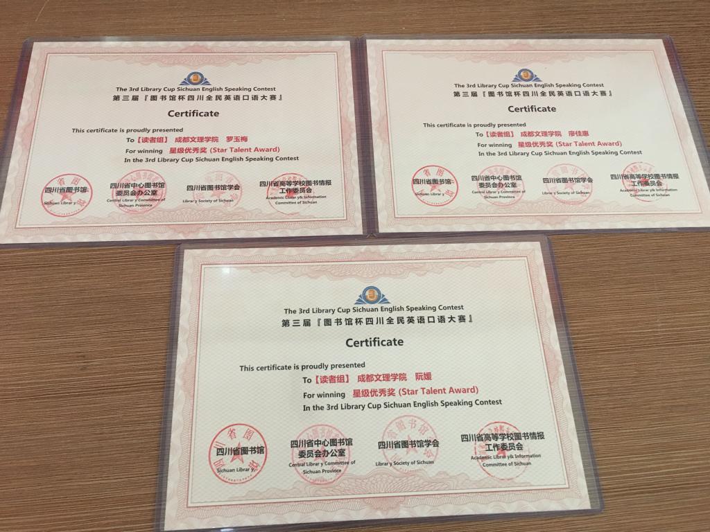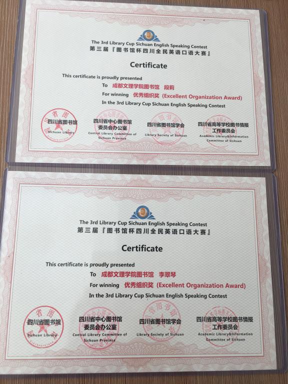 第三届“图书馆杯”四川全民英语口语大赛在“MET全民英语”平台线上开展,旨在充分展示和宣传四川社会各界在疫情防控工作中的先进典型和感人事迹,号召广大图书馆工作者和读者共同为疫情防控英雄们筑造精神铠甲,同时以多元化、数字化等新型服务手段,促进读者之间基于英语学习的交流。从2020年3月18日开始,四川省共123所图书馆参与组织大赛,吸引了16008位选手报名参赛。我校图书馆积极组织读者及馆员报名参加,本次活动共216人报名参加,在第三届“图书馆杯”四川全民英语口语大赛读者组中我校学子廖佳惠,罗玉梅,阮媛获得星级优秀奖,我校图书馆获得四川省优秀组织奖,其中李翠琴、段莉老师获得优秀组织奖个人奖。